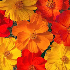 16) Cosmos ' Polidor' (photo du net ), se dégrade du rouge vermillon au jaune vif, tonique et gai, en climat doux, il fait plusieurs générations du début de l'été à la fin de l'automne.