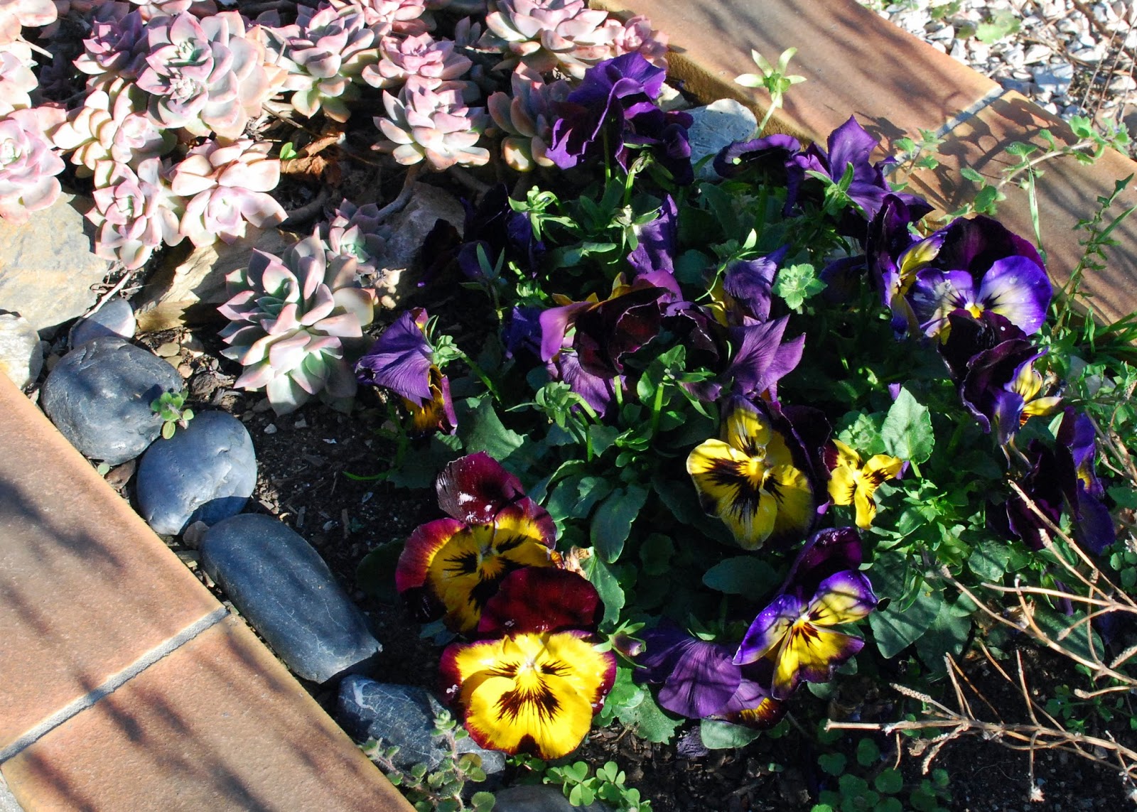 Le sol est pauvre globalement sur le terrain donc il faut éviter la pleine terre, mes annuelles sont souvent en pots ou en jardinières et pour l'instant ce sont les pensées qui font un tabac! Je les ai achetées comme chaque année en milieu d'automne et en grande quantité, deux cageots de 25 d'un excellent rapport qualité prix.