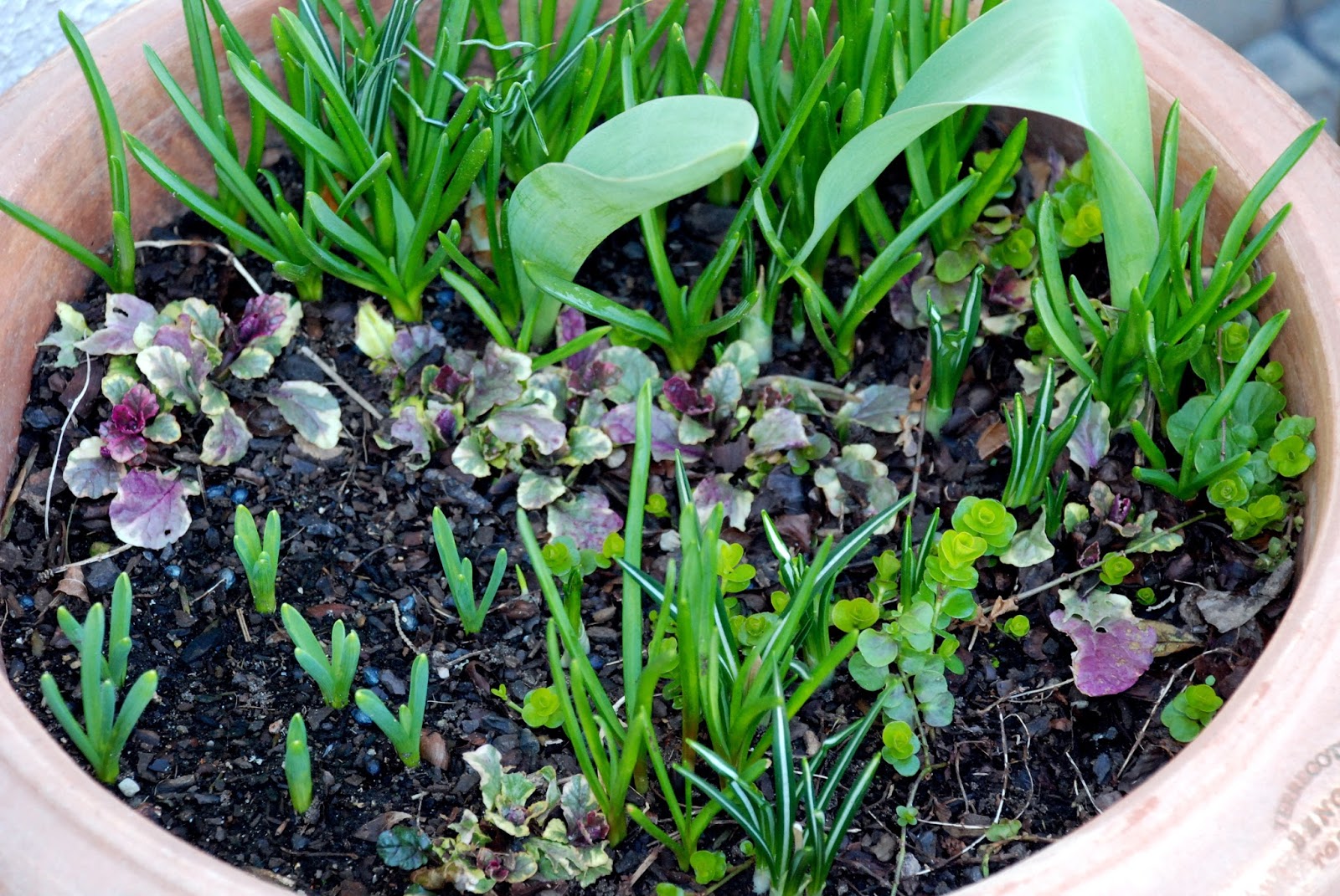 Plus de place pour des pensées dans le pot toscan, couvre-sols et petits bulbes s'éveillent doucement . |